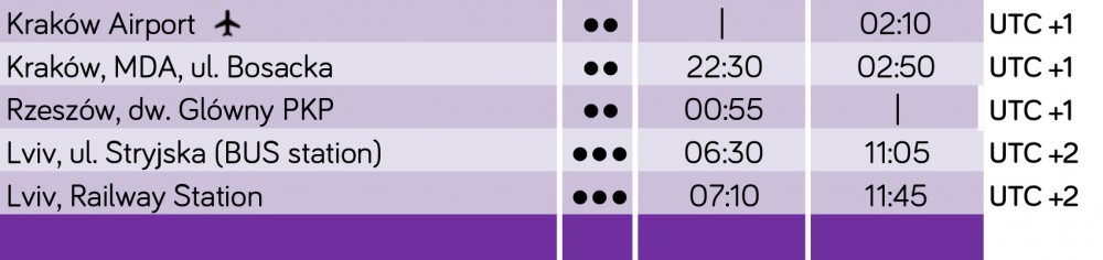 W kierunku Lwowa autobusy odjeżdżają z przystanku w Krakowie o godzinach 22:30 oraz 2:50. Dokładna trasa poniżej.