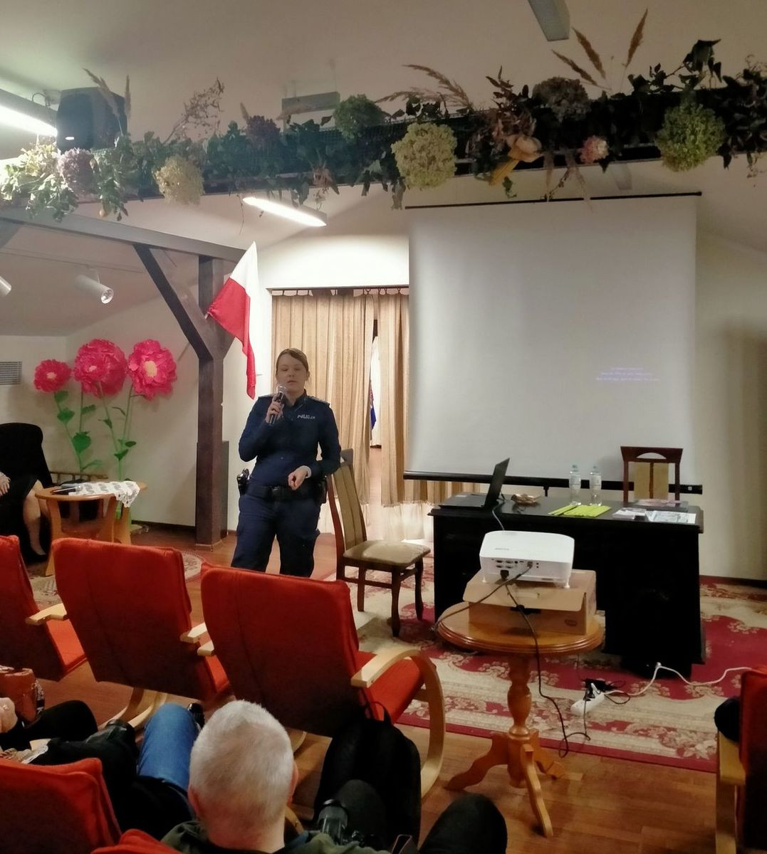 Policjantka wraz z przedstawicielem Zakładu Ubezpieczeń Społecznych spotkała się ze studentami Uniwersytetu Trzeciego Wieku, aby poruszyć temat szeroko pojętego bezpieczeństwa osobistego, finansowego i cyfrowego.