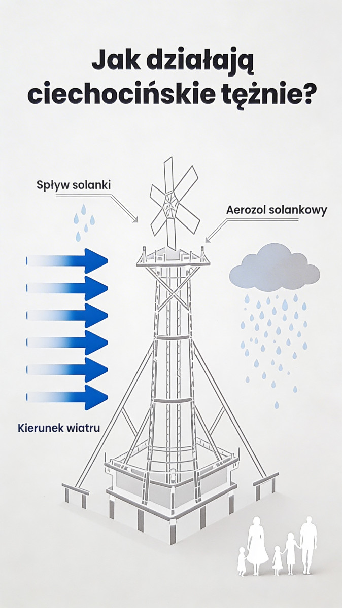 Tężnia to ogromny, drewniany inhalator. Solanka płynie na samą górę, a potem spływa po gałązkach tarniny. Wiatr rozbija krople, tworząc leczniczą mgiełkę, czyli aerozol. To właśnie go wdychasz dla zdrowia. Im bliżej ściany tężni stoisz, tym kuracja jest mocniejsza. Pamiętaj, by oddychać spokojnie – solanka potrzebuje czasu, by zadziałać.