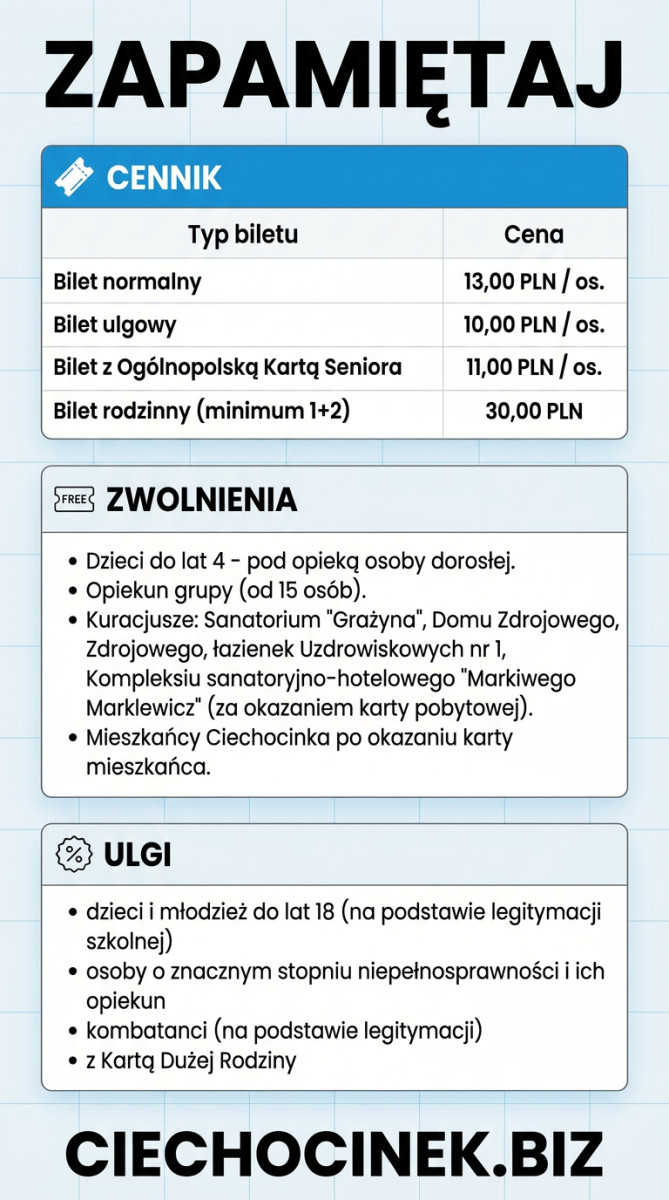 Pobór opłat za wstęp do strefy tężniowej w Ciechocinku rusza 10 kwietnia 2026 roku. Bilety obowiązują w piątki, soboty, niedziele oraz święta. Bilet normalny kosztuje 13,00 zł, a ulgowy 10,00 zł. W dni powszednie, od poniedziałku do czwartku, wstęp pozostaje bezpłatny.