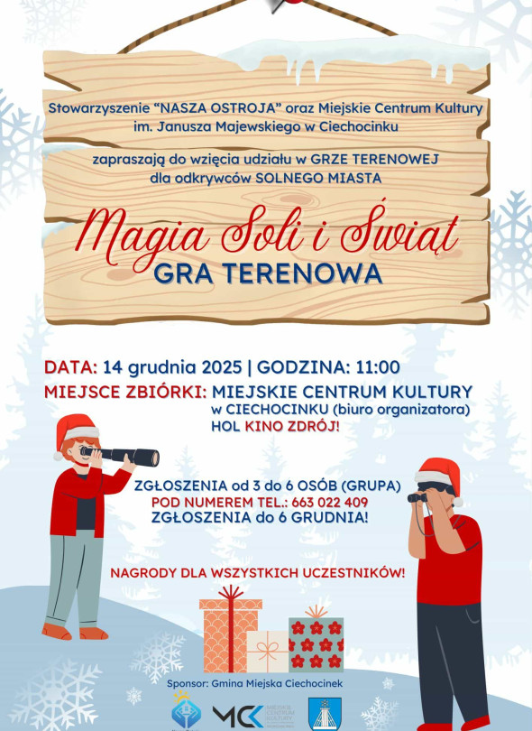 Magia Soli i Świąt – Gra Terenowa w Ciechocinku! Stowarzyszenie Nasza Ostoja oraz Miejskie Centrum Kultury im. Janusza Majewskiego w Ciechocinku serdecznie zapraszają wszystkich odkrywców i miłośników zimowej zabawy do udziału w wyjątkowej grze terenowej po Solnym Mieście! Data: 14 grudnia 2025Godzina: 11:00Miejsce zbiórki: Miejskie Centrum Kultury – hol „Kino Zdrój” Zbierz drużynę i wyruszcie