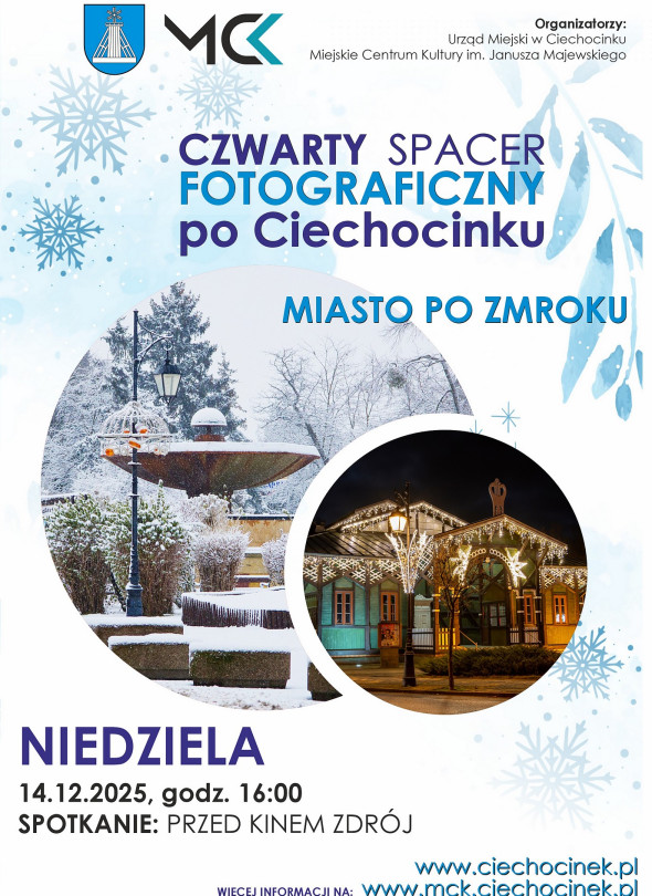 Ciechocinek po zmroku – ruszamy na zimowy fotospacer! Miasto po zachodzie słońca nabiera zupełnie innego klimatu: ciche uliczki, połyskujące lampy, świąteczne ozdoby... Zabieramy aparaty i łapiemy wszystko, co tworzy tę niepowtarzalną, wieczorną atmosferę. Spotykamy się, by szukać magii światła po zmroku! Zimowy chłód, para w powietrzu, migotanie latarni, świąteczny klimat, odbicia w mokrych chodnikach