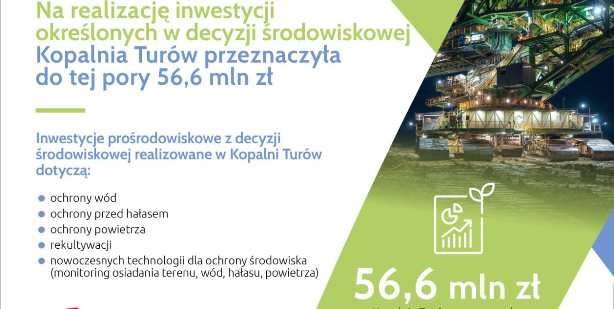 Kopalnia Turów na bieżąco wypełnia zobowiązania z decyzji środowiskowej, wydanej przez Generalnego Dyrektora Ochrony Środowiska, poprzez realizację szeregu inwestycji i działań proekologicznych ograniczających jej wpływ na pobliskie tereny Polski, Czech i Niemiec. Na wszystkie działania kopalni wynikające decyzji środowiskowej przeznaczono do tej pory ok. 56,6 mln zł.