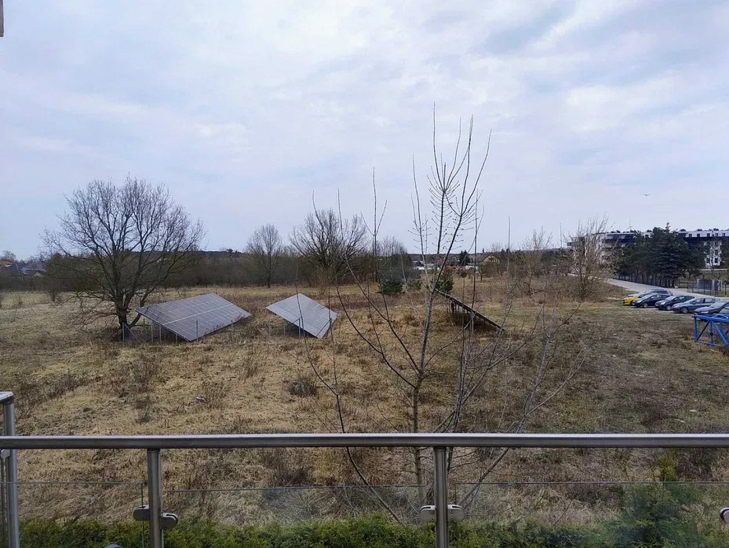 Balkon wychodzi na teren zamkniętego osiedla z dużą ilością zieleni.