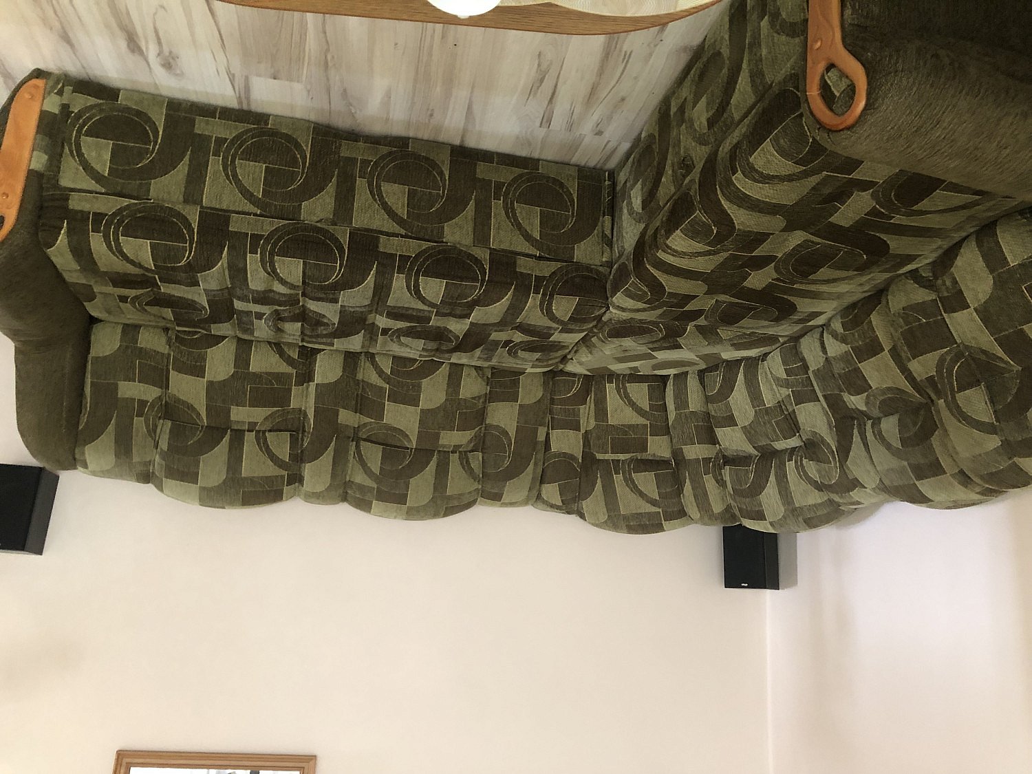 Wygodny duży narożnik z funkcją spania w kolorze zieleni. Dodatkowo dwie otwierane pufy.
